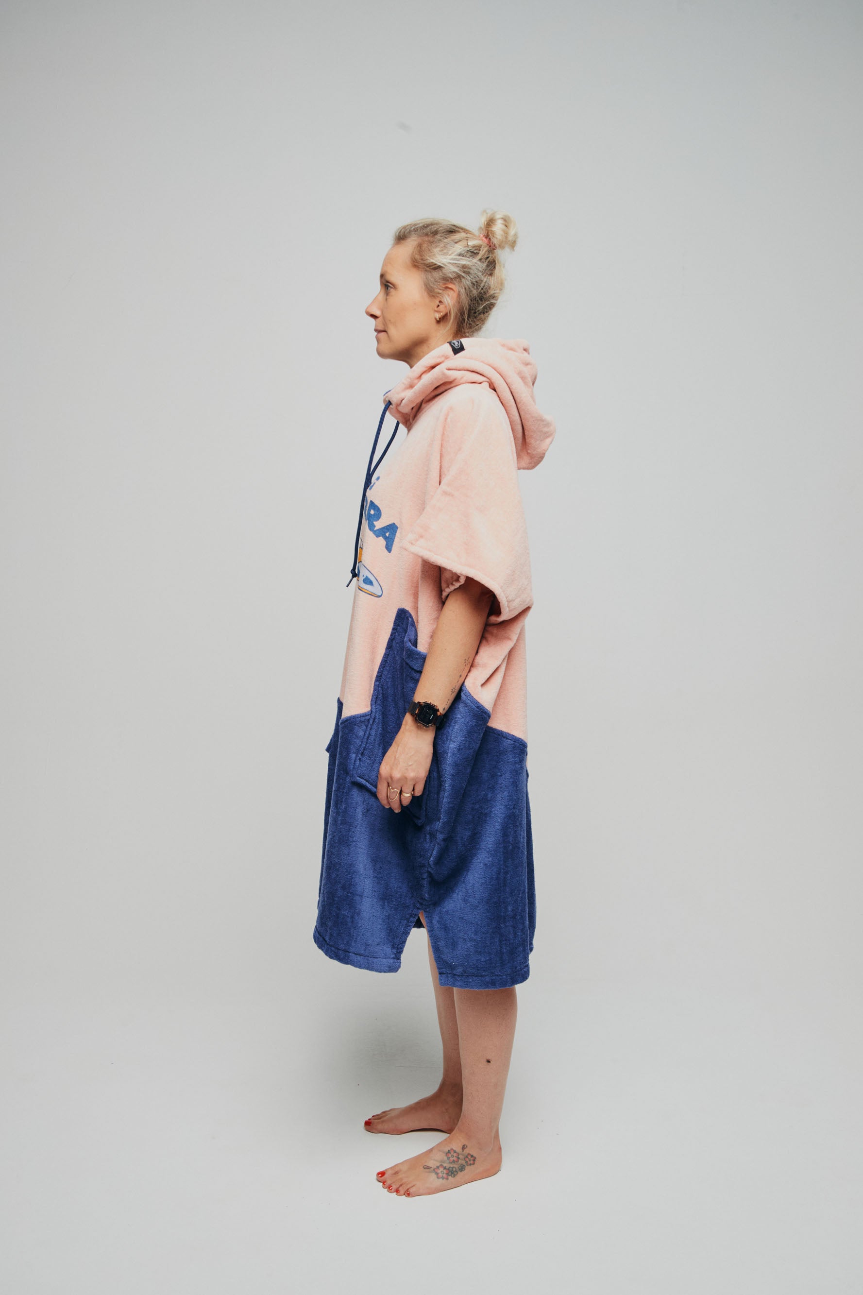 Grâce à sa forme triangulaire ou « en V », le haut de ce poncho est plus large que sur nos modèles Classic. Et toujours aussi doux et confortable (éponge velours 100% coton) ! Nous avons créé ce poncho pour vous garantir une plus grande liberté de mouvement au niveau des bras et des épaules. Plus pratique pour se changer et chaleur conservée grâce aux manches allongées, c’est pas le top ça ? Allez, on ajoute la cerise sur le gateau : une capuche doublée et 2 grandes poches sur les côtés. On se doutait que ça allait vous plaire…