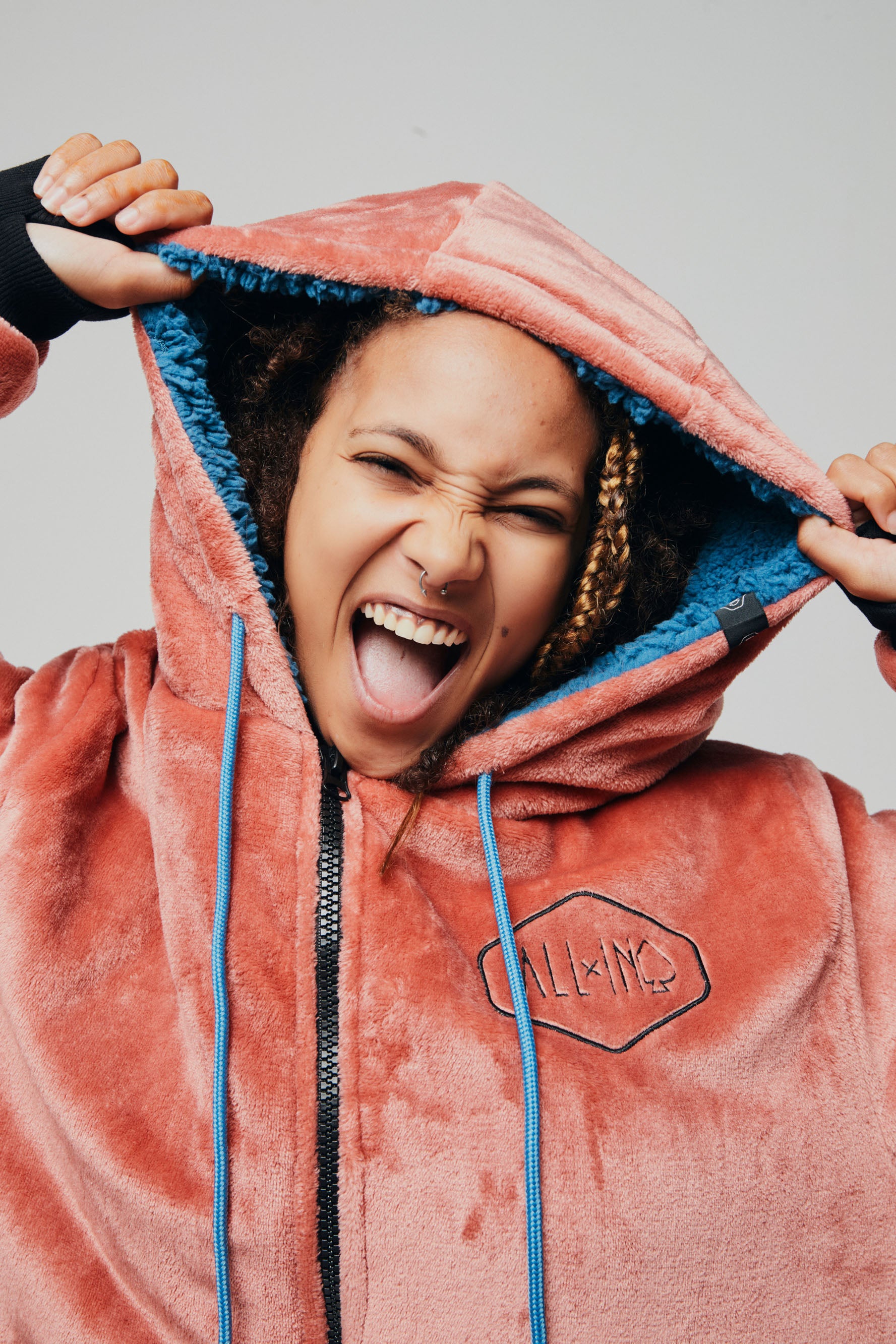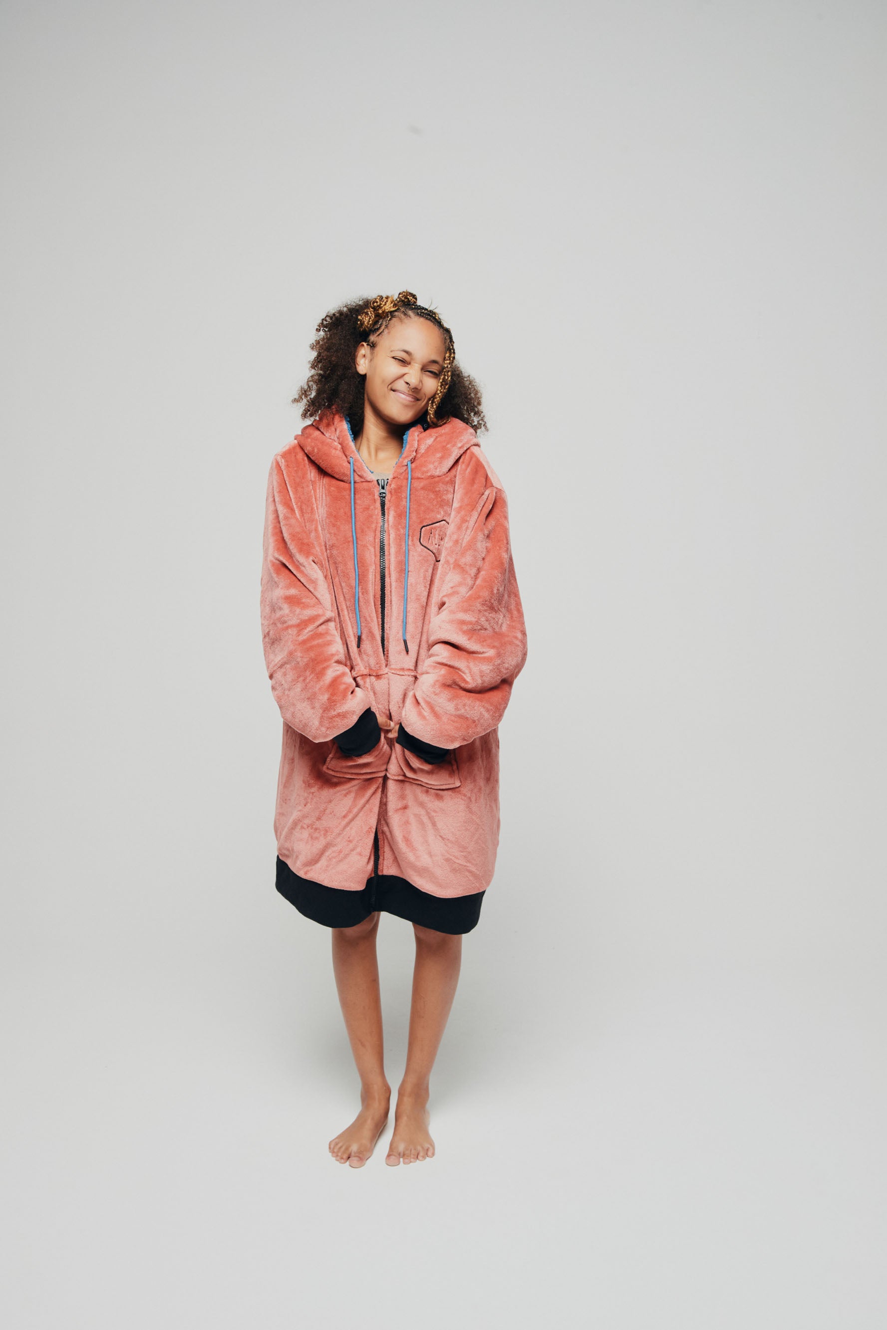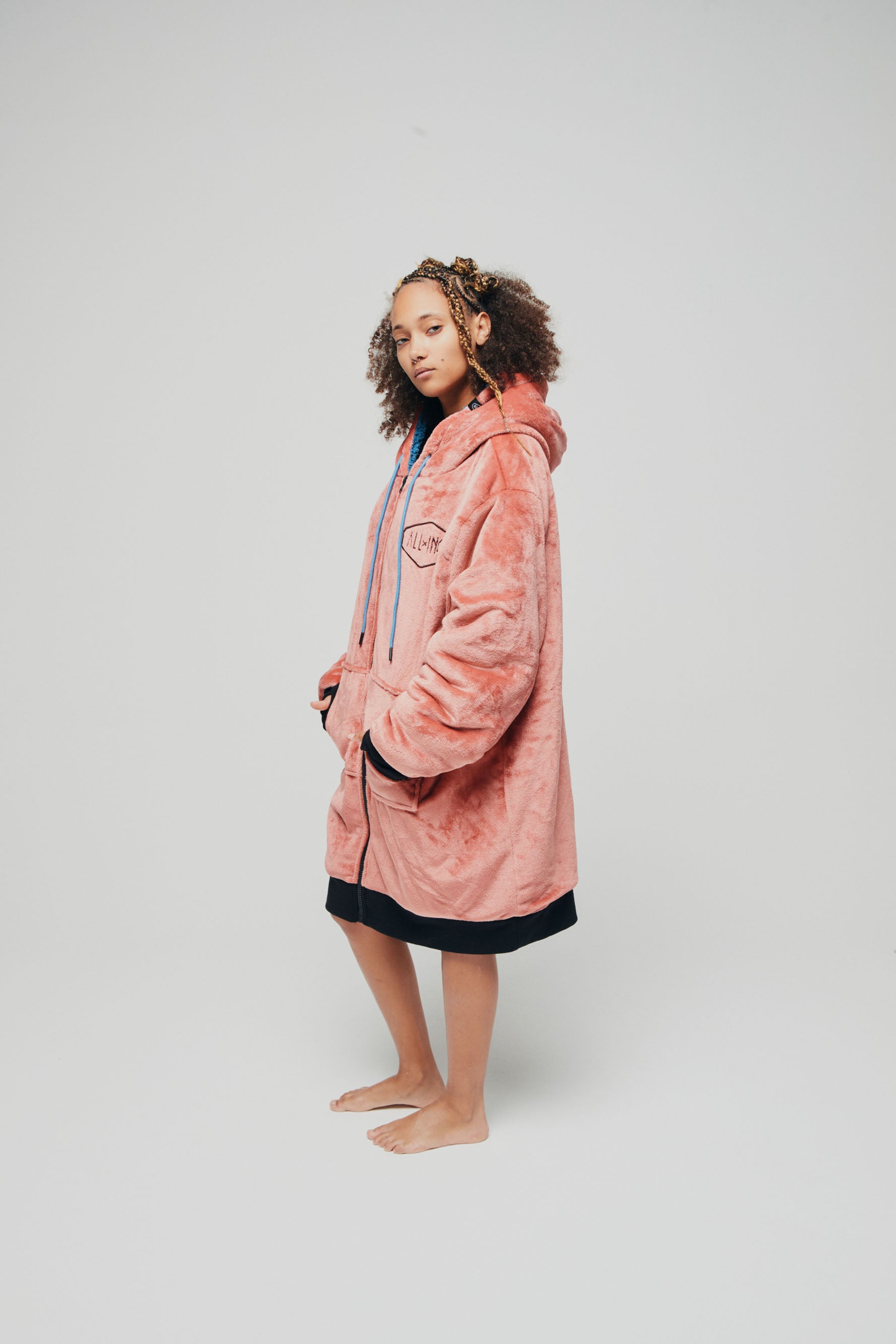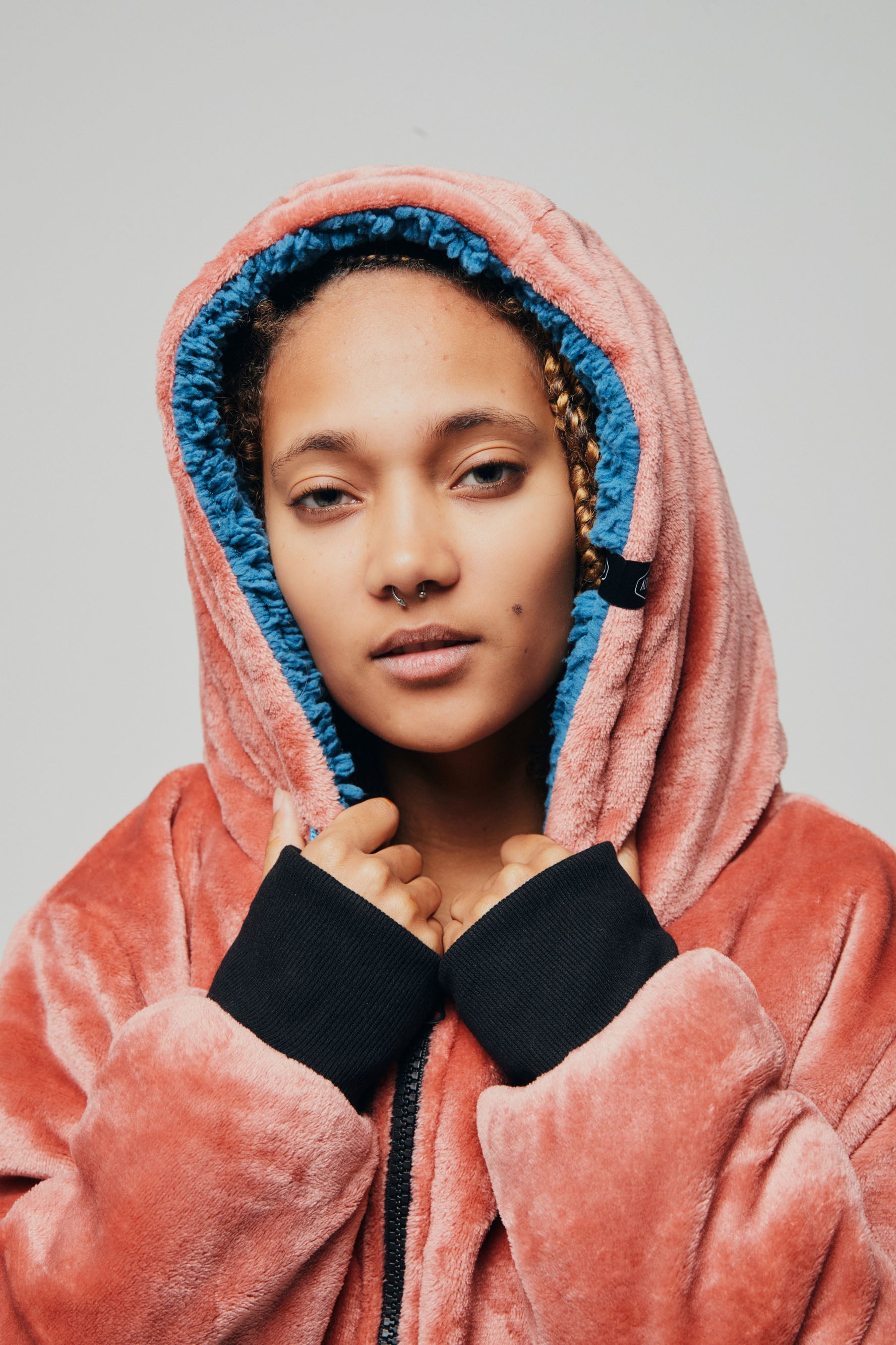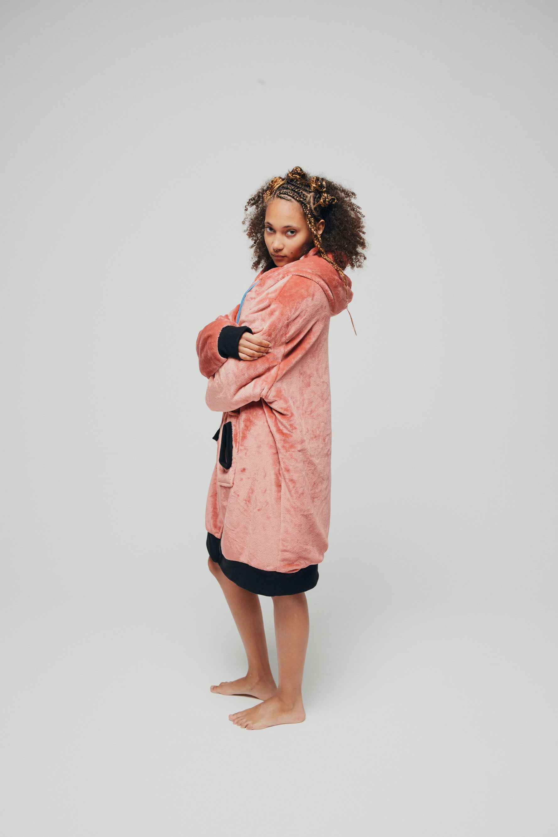 Comme un sweat à capuche : manches longues avec ouvertures pour les pouces, capuche doublée et ajustable avec liens, deux grandes poches