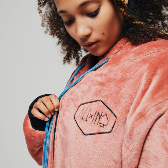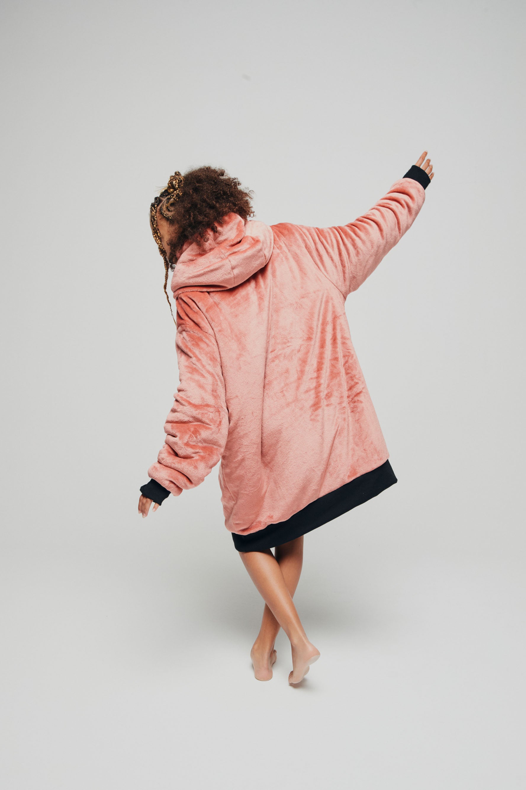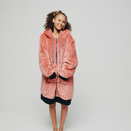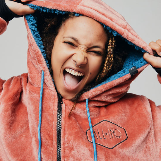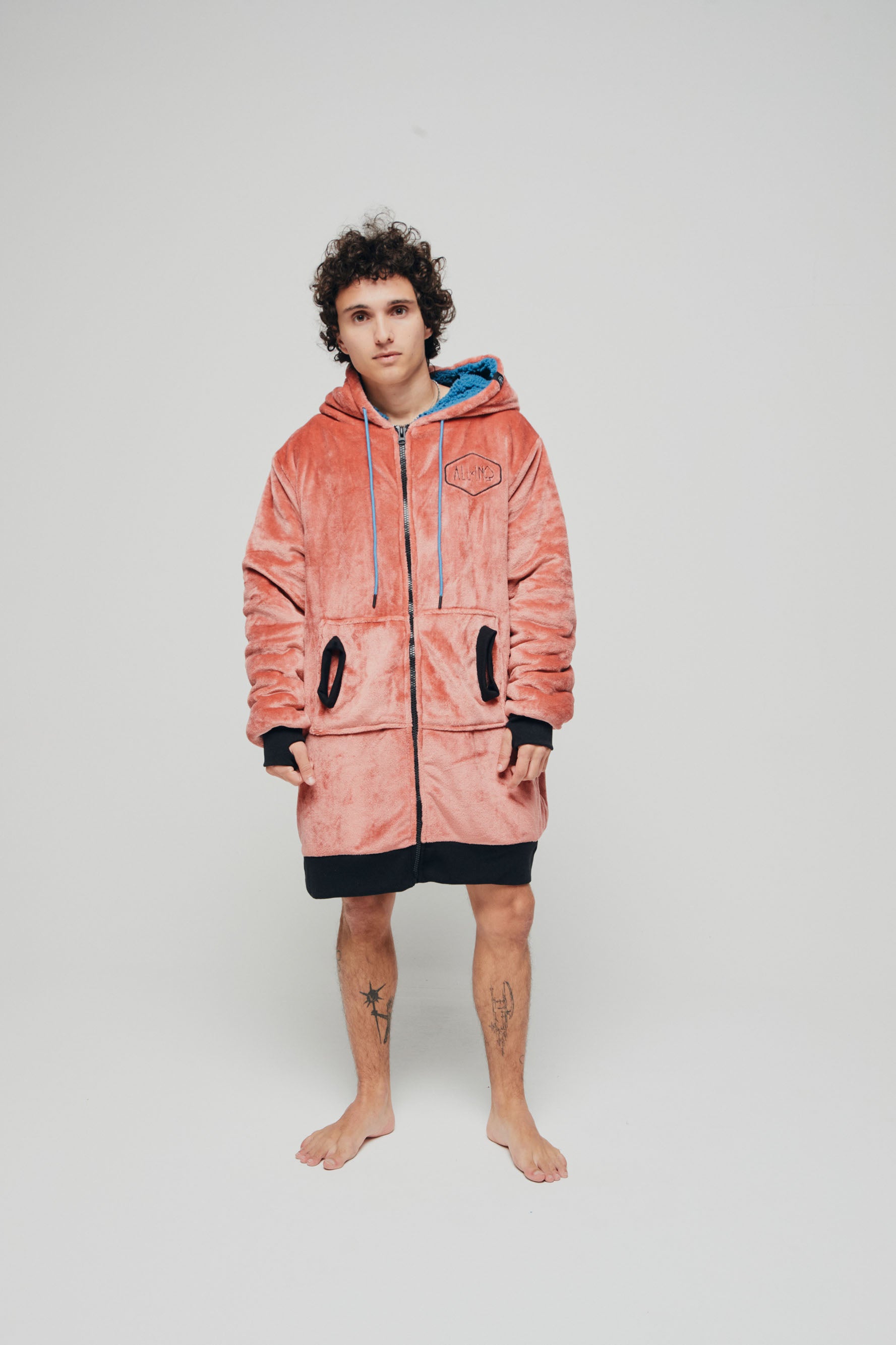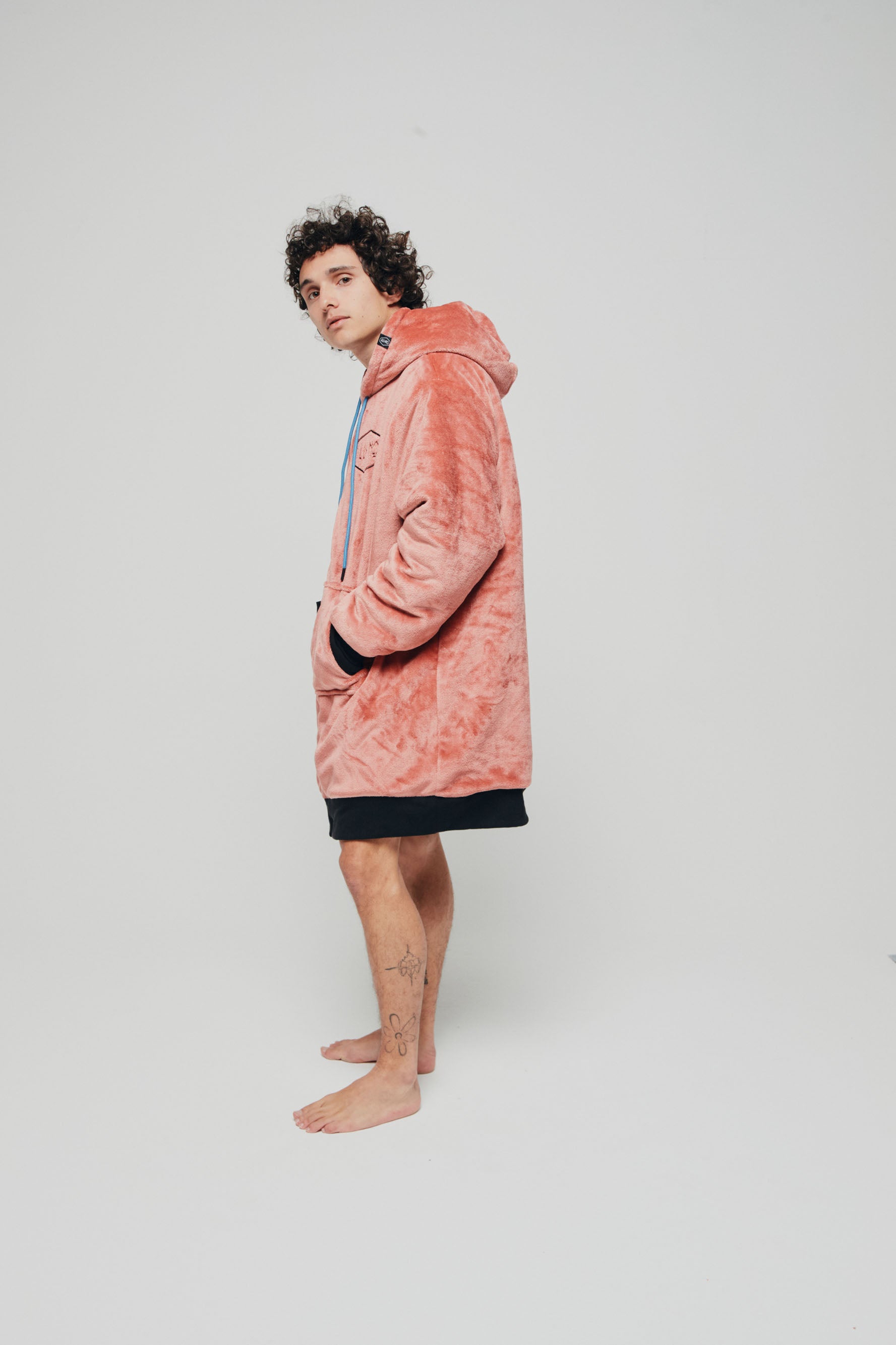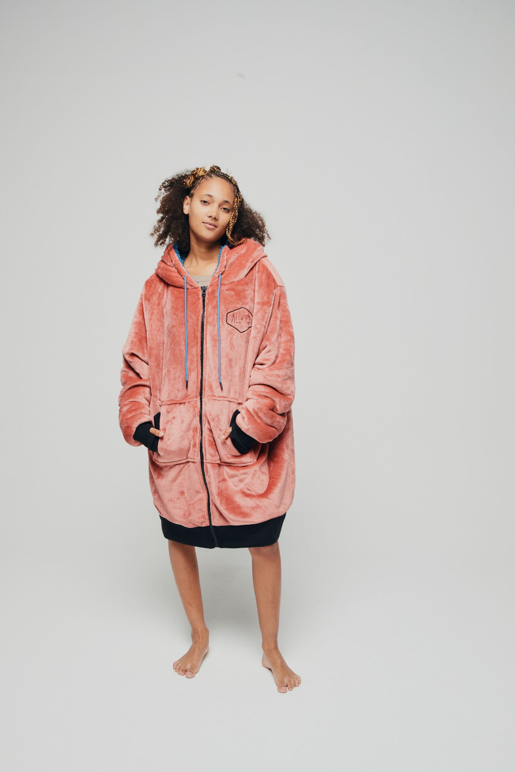 Comme un sweat à capuche : manches longues avec ouvertures pour les pouces, capuche doublée et ajustable avec liens, deux grandes poches