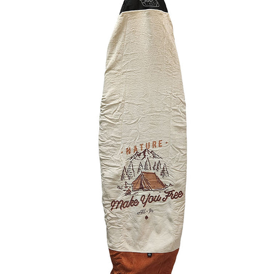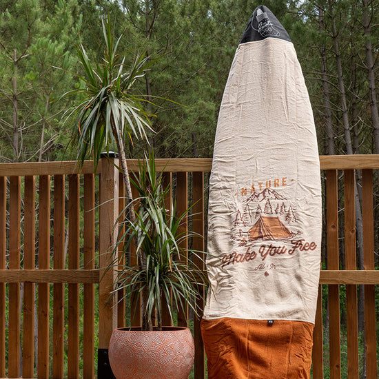 Transported, ridden, waxed, wet... Your board also deserves a little softness. Pamper it with our "sock", the traditional protective cover for surfboards. Designed in 100% cotton velour terry cloth, thick, absorbent and resistant, it fits the contours of your board to ensure complete protection and allows you to transport it without damaging or dirtying your vehicle. We have taken care to reinforce the nose (the end of the cover) with an ultra-resistant RipStop Nylon fabric. An internal Nylon pocket strategically placed as reinforcement at the fins allows you to store leash or accessories. The cover closes with a drawstring. Finally, it's cool to be a surfboard.
