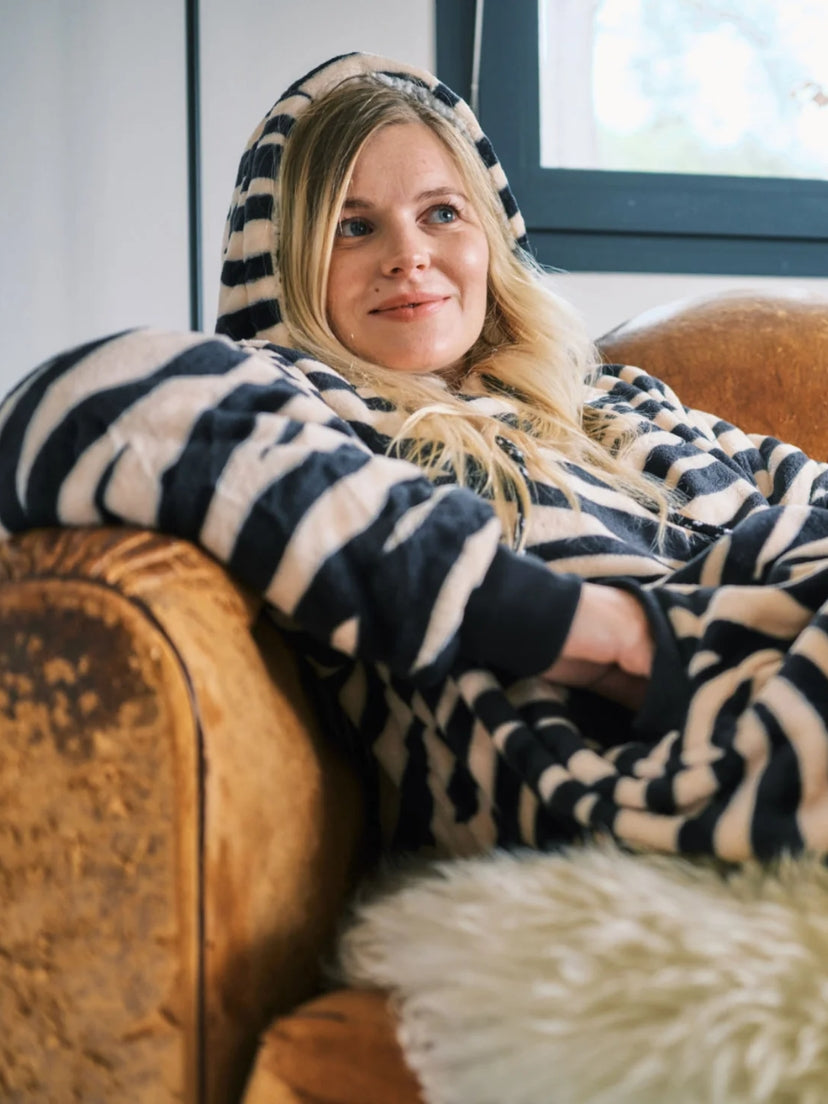 With the ALL-IN Plaid Poncho, you can make your dream come true: chill out in front of Netflix in a warm, soft and comfortable outfit that you won't want to leave. No more need for plaid in front of the TV, you've found the ideal, practical pullover blanket with this Hoodie-style Poncho, which lets you stay warm while retaining the use of your arms. Of course, for even greater comfort, we've added a hood, openings for your thumbs and a large pocket on the front to keep your hands warm. Thanks to its loose oversized cut, it's suitable for the whole family, and you can snuggle your legs inside for maximum comfort and chill. Our Plaid Poncho is the ultimate in softness, with its velvet exterior and soft sherpa interior, all 100% recycled and GRS (Global Recycled Standard) certified. Want to change color? Easy, it's fully reversible! Activate cocooning mode while respecting the planet with this mixed model, easy to care for without losing any of its softness.