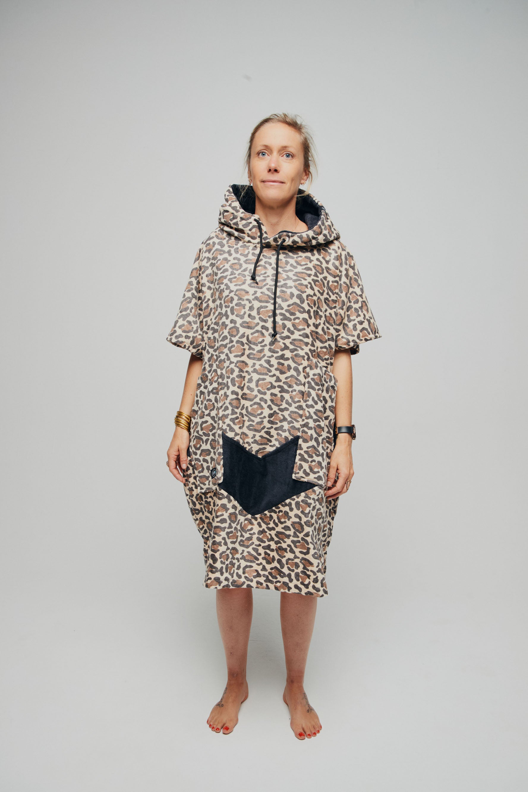 Thanks to its triangular or "V" shape, the top of this poncho is wider than on our Classic models. And as soft and comfortable as ever (100% cotton velour terry)! We've designed this poncho to give you greater freedom of movement in the arms and shoulders. How's that for practicality when changing clothes and warmth when wearing long sleeves? And then there's the icing on the cake: a lined hood and 2 large side pockets. We knew you'd love it...