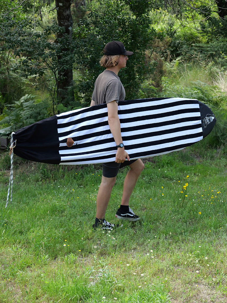 Transported, ridden, waxed, wet... Your board also deserves a little softness. Pamper it with our "sock", the traditional protective cover for surfboards. Designed in 100% cotton velour terry cloth, thick, absorbent and resistant, it fits the contours of your board to ensure complete protection and allows you to transport it without damaging or dirtying your vehicle. We have taken care to reinforce the nose (the end of the cover) with an ultra-resistant RipStop Nylon fabric. An internal Nylon pocket strategically placed as reinforcement at the fins allows you to store leash or accessories. The cover closes with a drawstring. Finally, it's cool to be a surfboard.