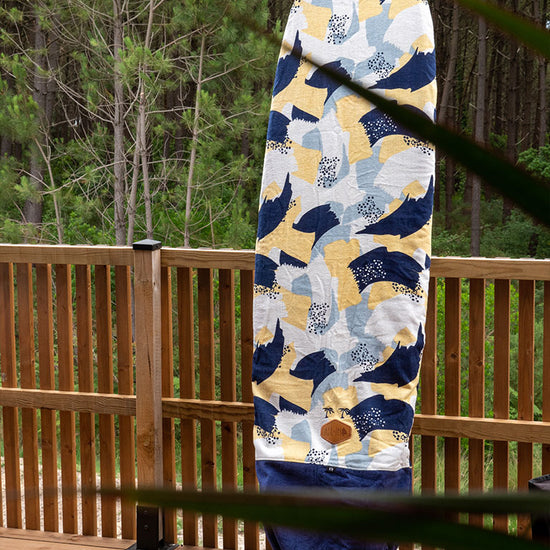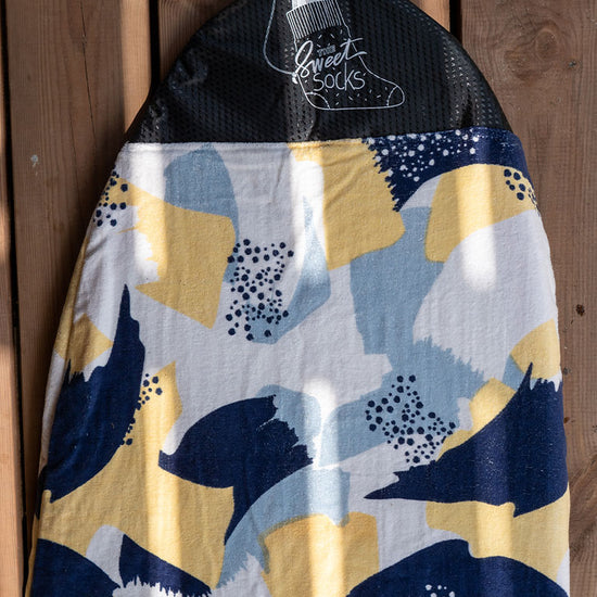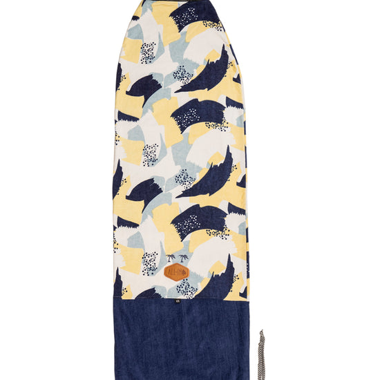 Transported, ridden, waxed, wet... Your board also deserves a little softness. Pamper it with our "sock", the traditional protective cover for surfboards. Designed in 100% cotton velour terry cloth, thick, absorbent and resistant, it fits the contours of your board to ensure complete protection and allows you to transport it without damaging or dirtying your vehicle. We have taken care to reinforce the nose (the end of the cover) with an ultra-resistant RipStop Nylon fabric. An internal Nylon pocket strategically placed as reinforcement at the fins allows you to store leash or accessories. The cover closes with a drawstring. Finally, it's cool to be a surfboard.