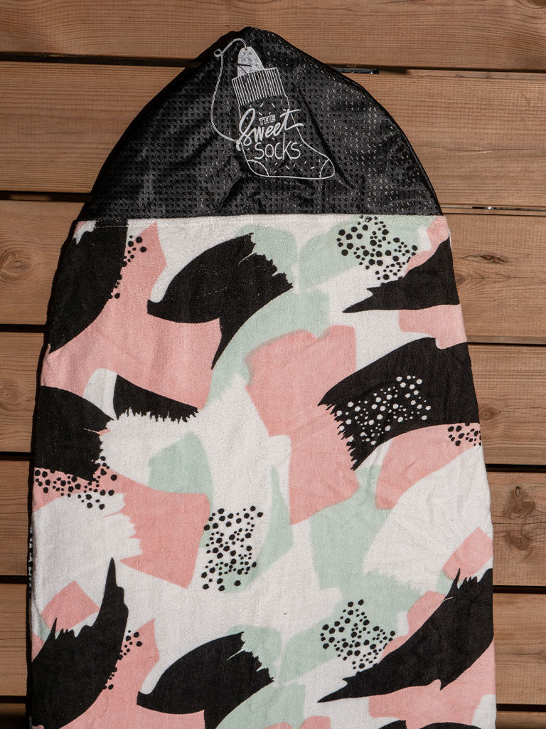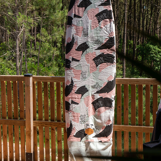 Transported, ridden, waxed, wet... Your board also deserves a little softness. Pamper it with our "sock", the traditional protective cover for surfboards. Designed in 100% cotton velour terry cloth, thick, absorbent and resistant, it fits the contours of your board to ensure complete protection and allows you to transport it without damaging or dirtying your vehicle. We have taken care to reinforce the nose (the end of the cover) with an ultra-resistant RipStop Nylon fabric. An internal Nylon pocket strategically placed as reinforcement at the fins allows you to store leash or accessories. The cover closes with a drawstring. Finally, it's cool to be a surfboard.
