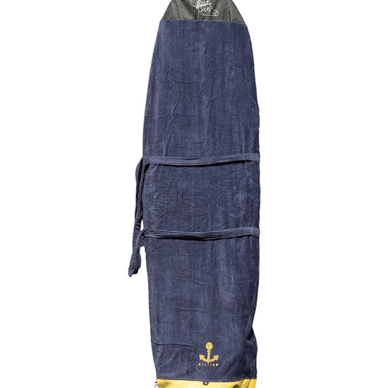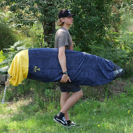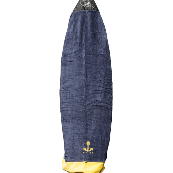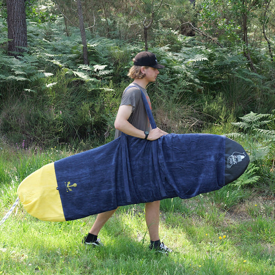 Transported, ridden, waxed, wet... Your board also deserves a little softness. Pamper it with our "sock", the traditional protective cover for surfboards. Designed in 100% cotton velour terry cloth, thick, absorbent and resistant, it fits the contours of your board to ensure complete protection and allows you to transport it without damaging or dirtying your vehicle. We have taken care to reinforce the nose (the end of the cover) with an ultra-resistant RipStop Nylon fabric. An internal Nylon pocket strategically placed as reinforcement at the fins allows you to store leash or accessories. The cover closes with a drawstring. Finally, it's cool to be a surfboard.