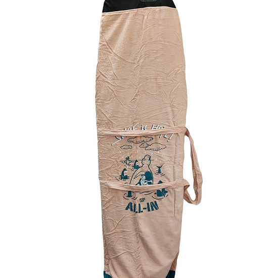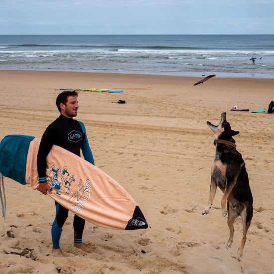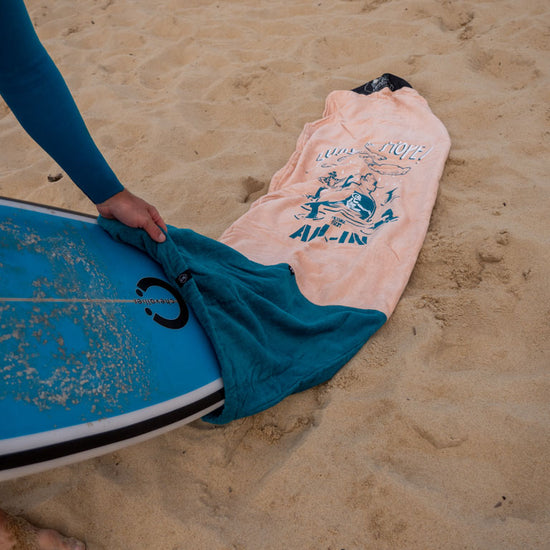 Transported, ridden, waxed, wet... Your board also deserves a little softness. Pamper it with our "sock", the traditional protective cover for surfboards. Designed in 100% cotton velour terry cloth, thick, absorbent and resistant, it fits the contours of your board to ensure complete protection and allows you to transport it without damaging or dirtying your vehicle. We have taken care to reinforce the nose (the end of the cover) with an ultra-resistant RipStop Nylon fabric. An internal Nylon pocket strategically placed as reinforcement at the fins allows you to store leash or accessories. The cover closes with a drawstring. Finally, it's cool to be a surfboard.