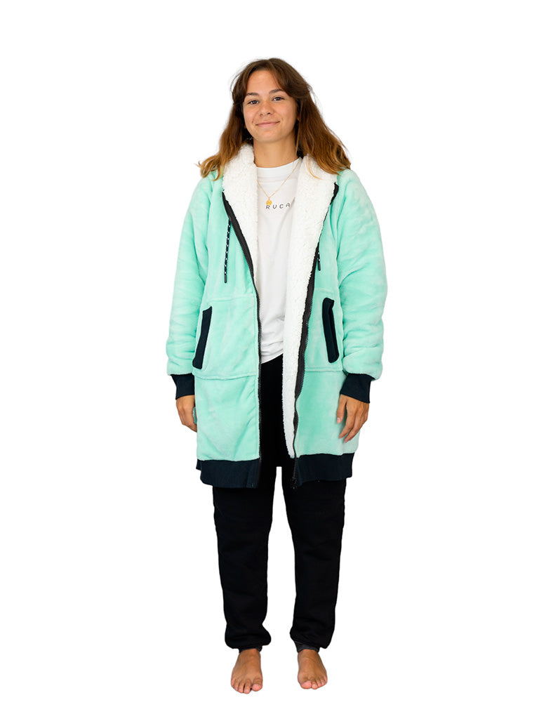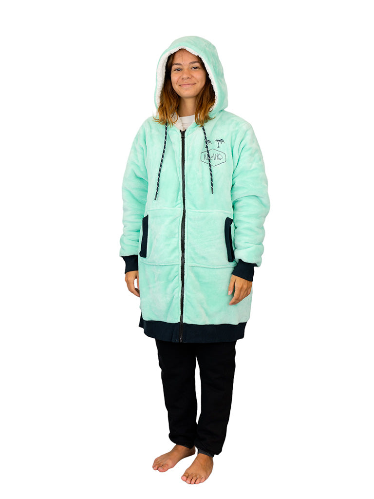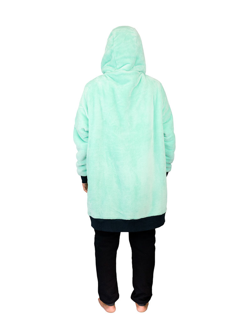 - Like a hoodie: long sleeves with thumbholes, lined and adjustable hood with ties, large kangaroo pocket on the front.