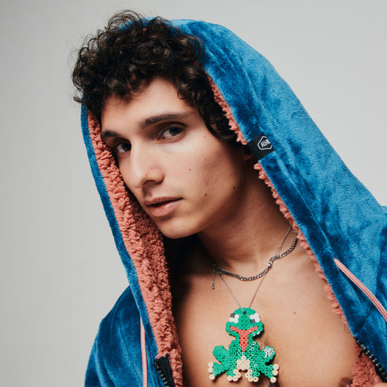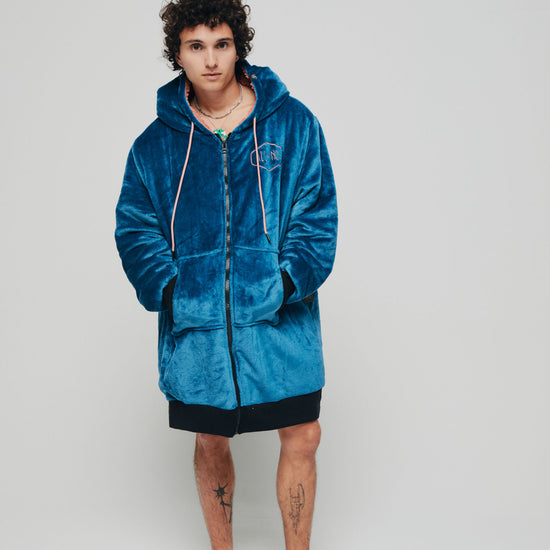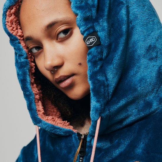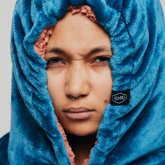 - Suave tejido 100% reciclado certificado GRS (Global Recycled Standard): terciopelo en el exterior, forro polar sherpa en el interior.