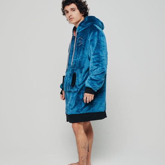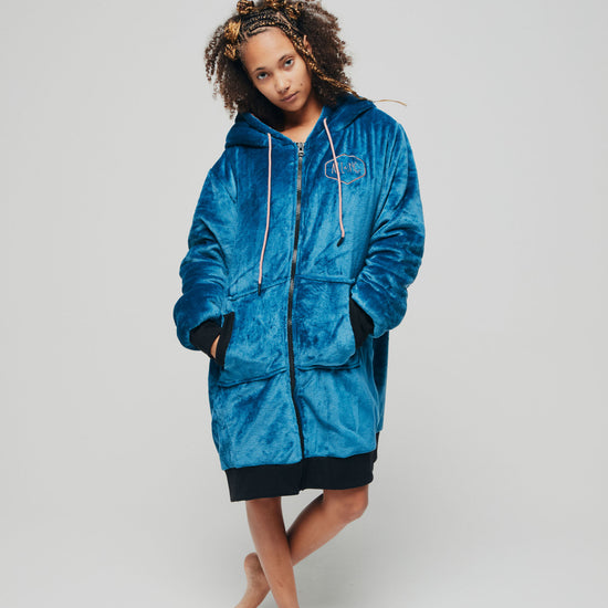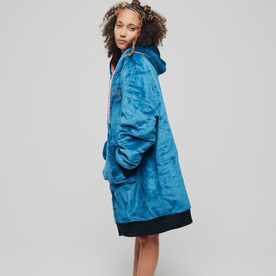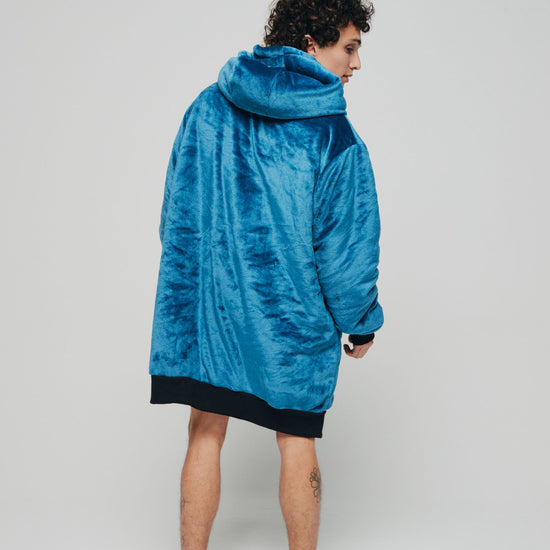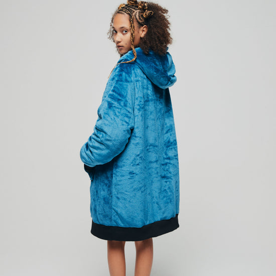 - Comme un sweat à capuche : manches longues avec ouvertures pour les pouces, capuche doublée et ajustable avec liens, deux grandes poches