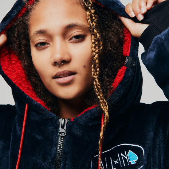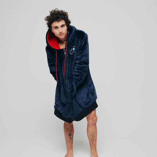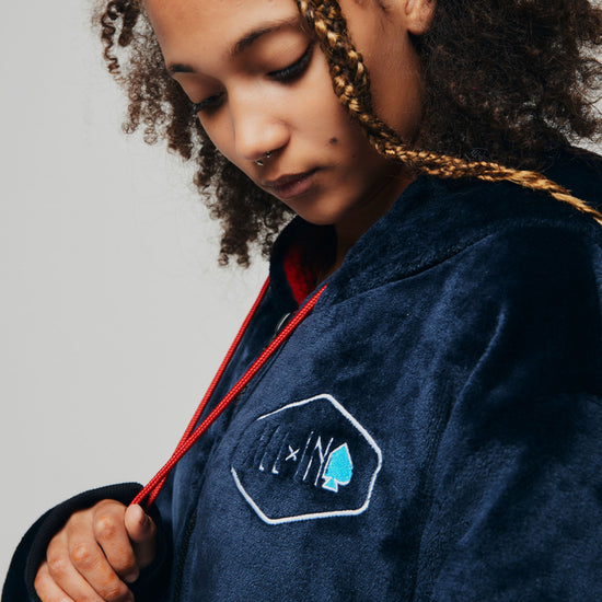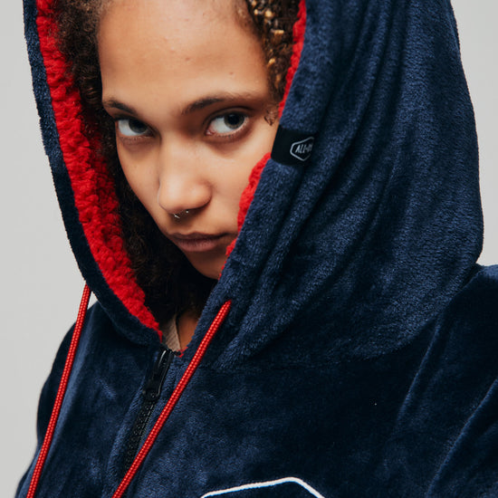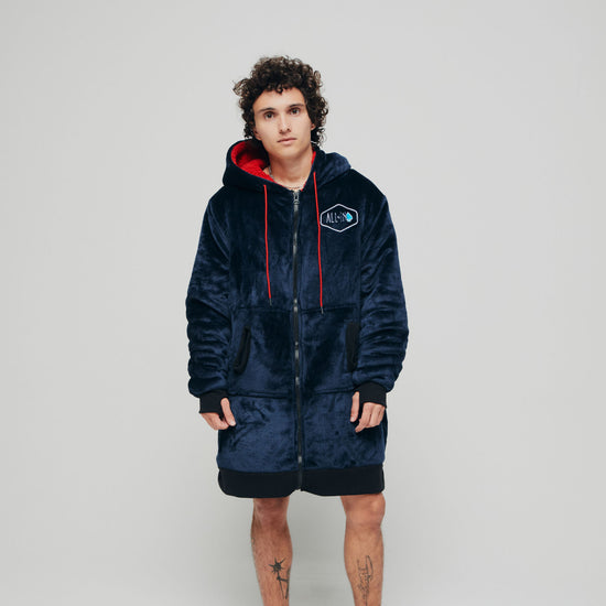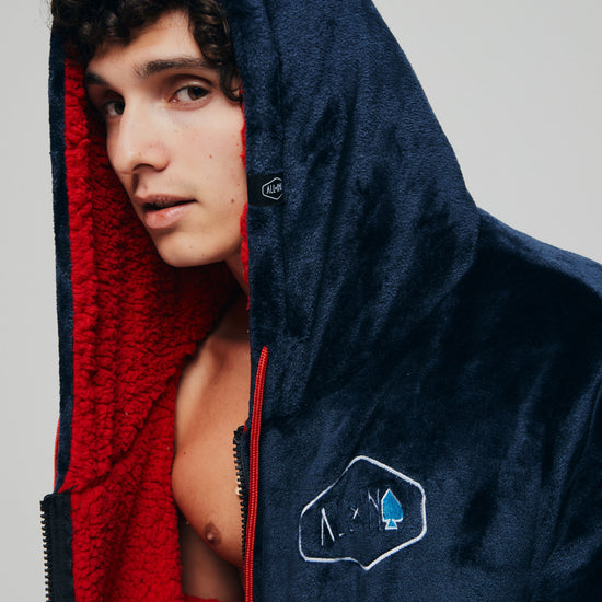 - Suave tejido 100% reciclado certificado GRS (Global Recycled Standard): terciopelo en el exterior, forro polar sherpa en el interior.