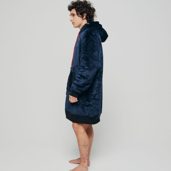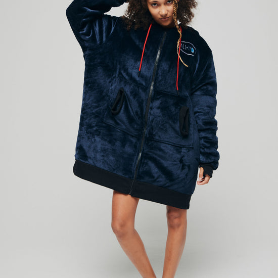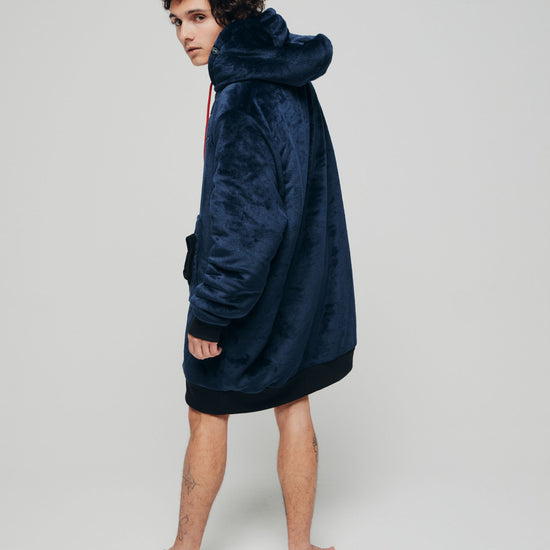 - Comme un sweat à capuche : manches longues avec ouvertures pour les pouces, capuche doublée et ajustable avec liens, deux grandes poches
