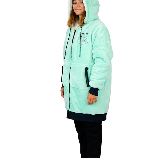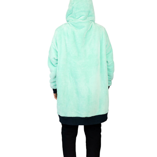 - Como una sudadera con capucha: mangas largas con orificios para los pulgares, capucha forrada con lazos ajustables, gran bolsillo delantero tipo canguro.