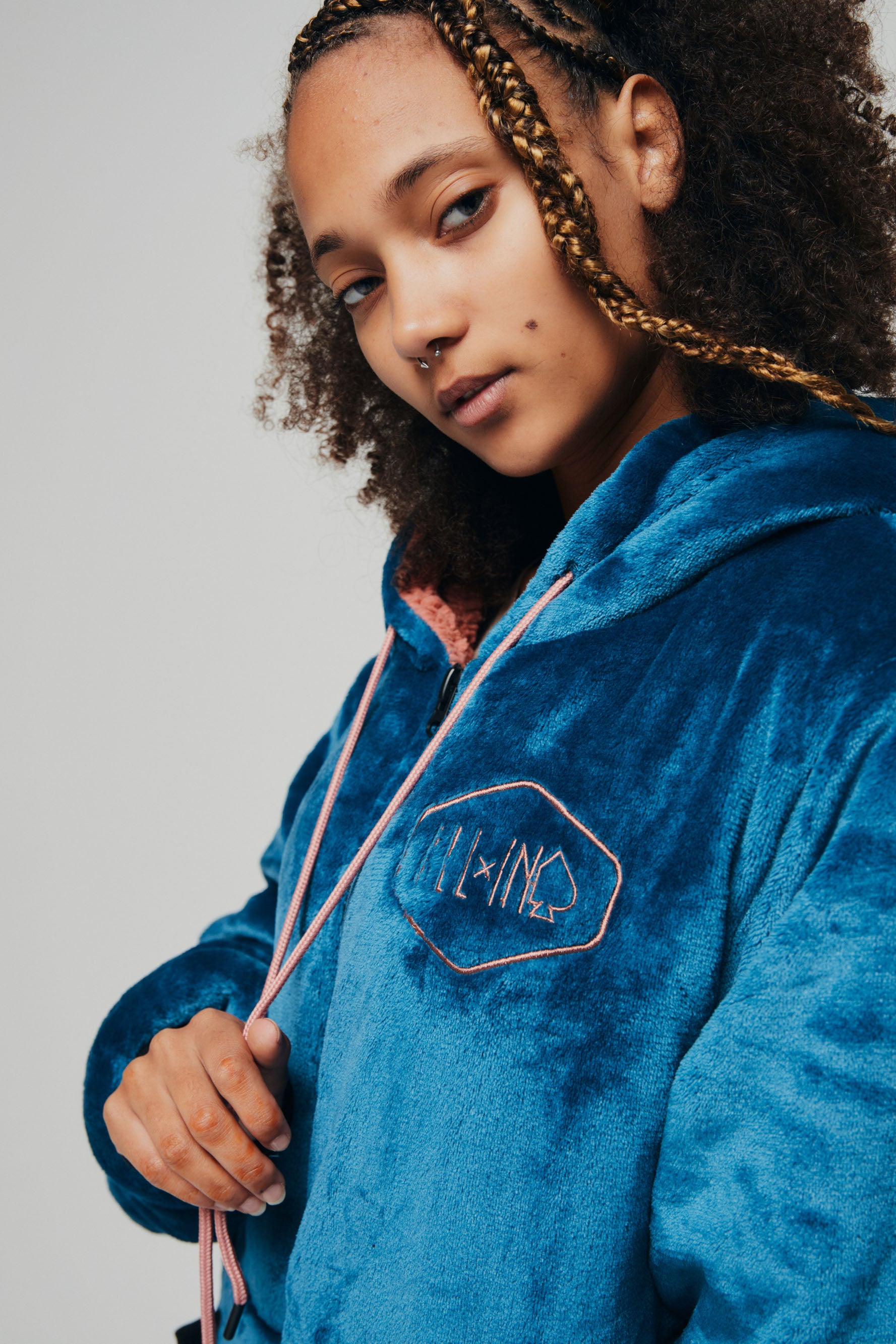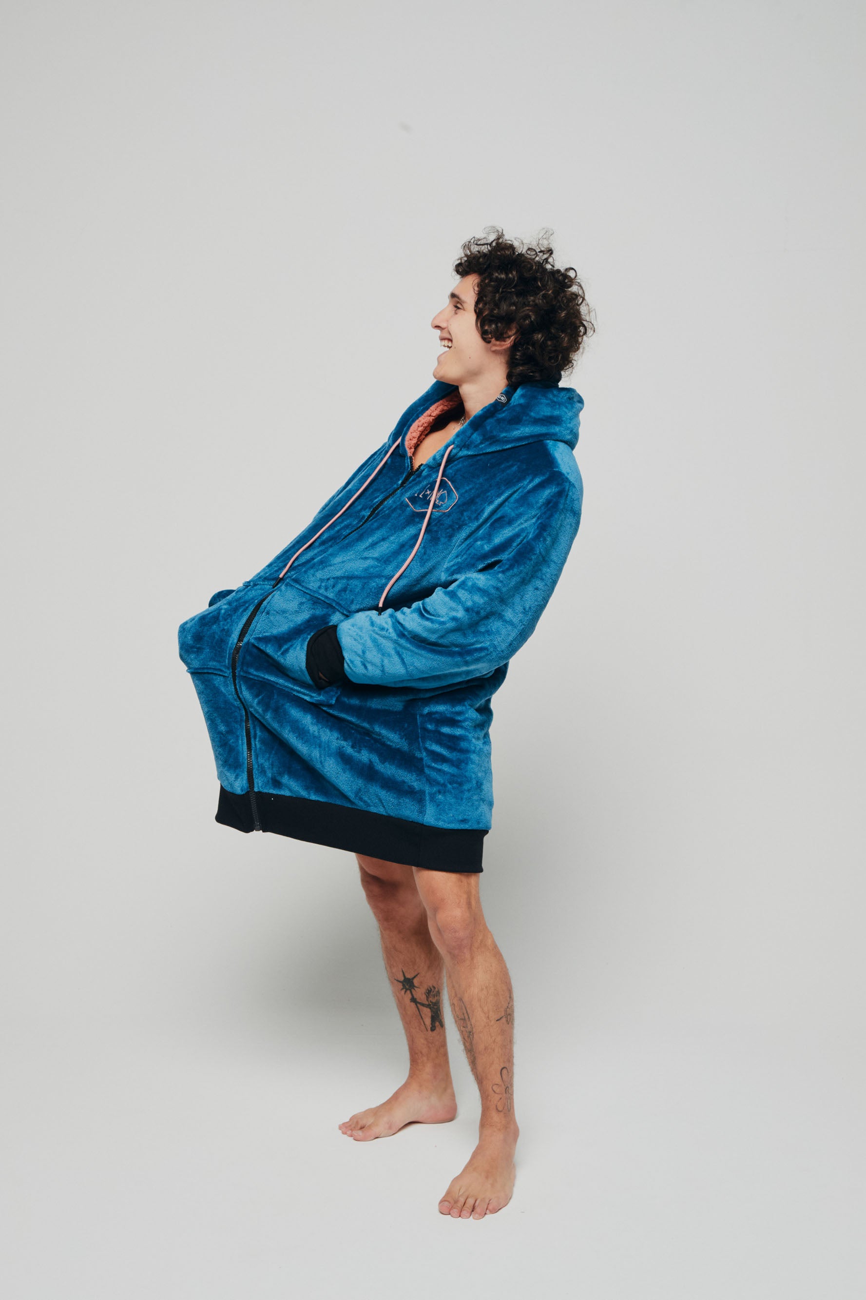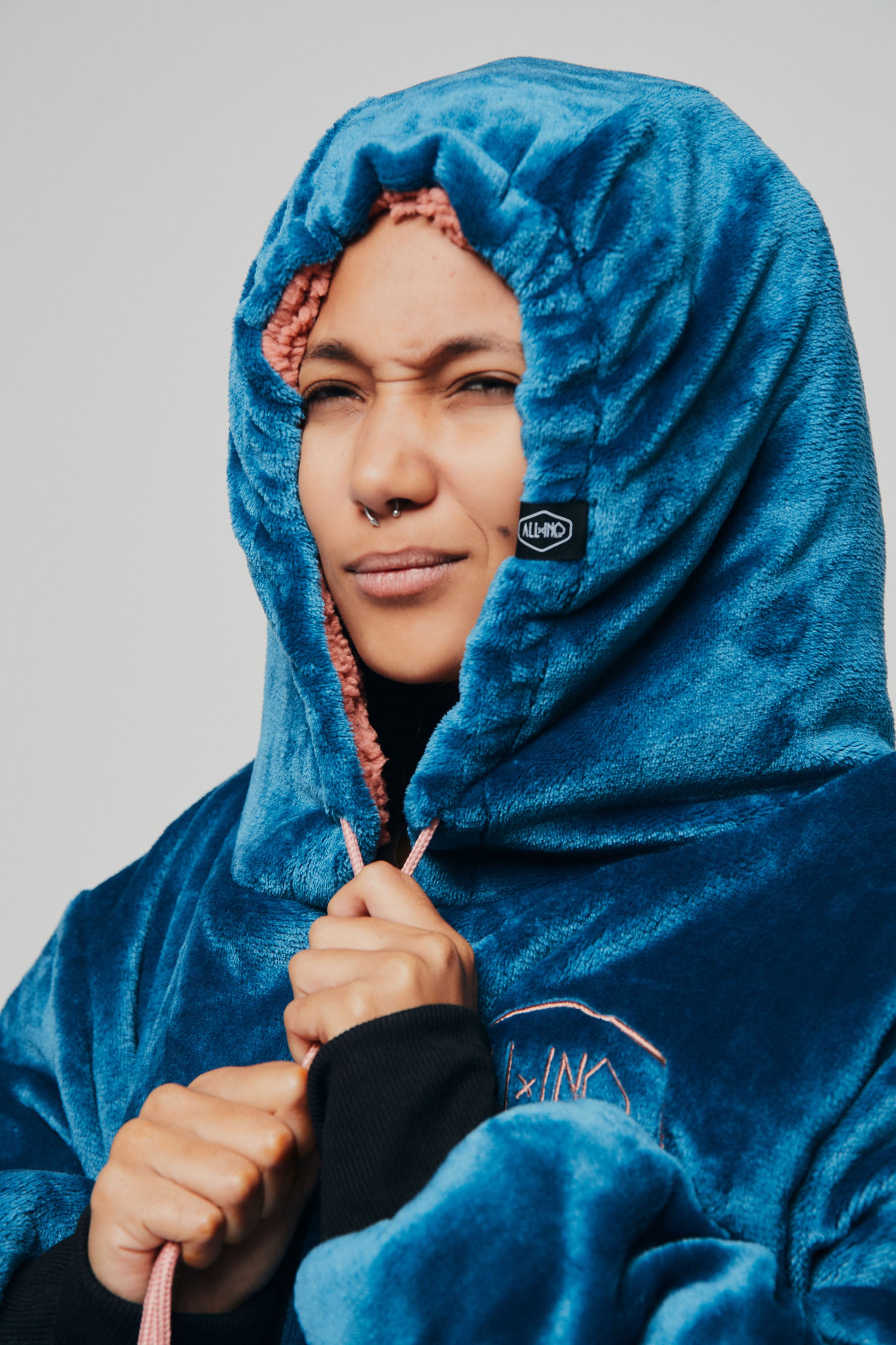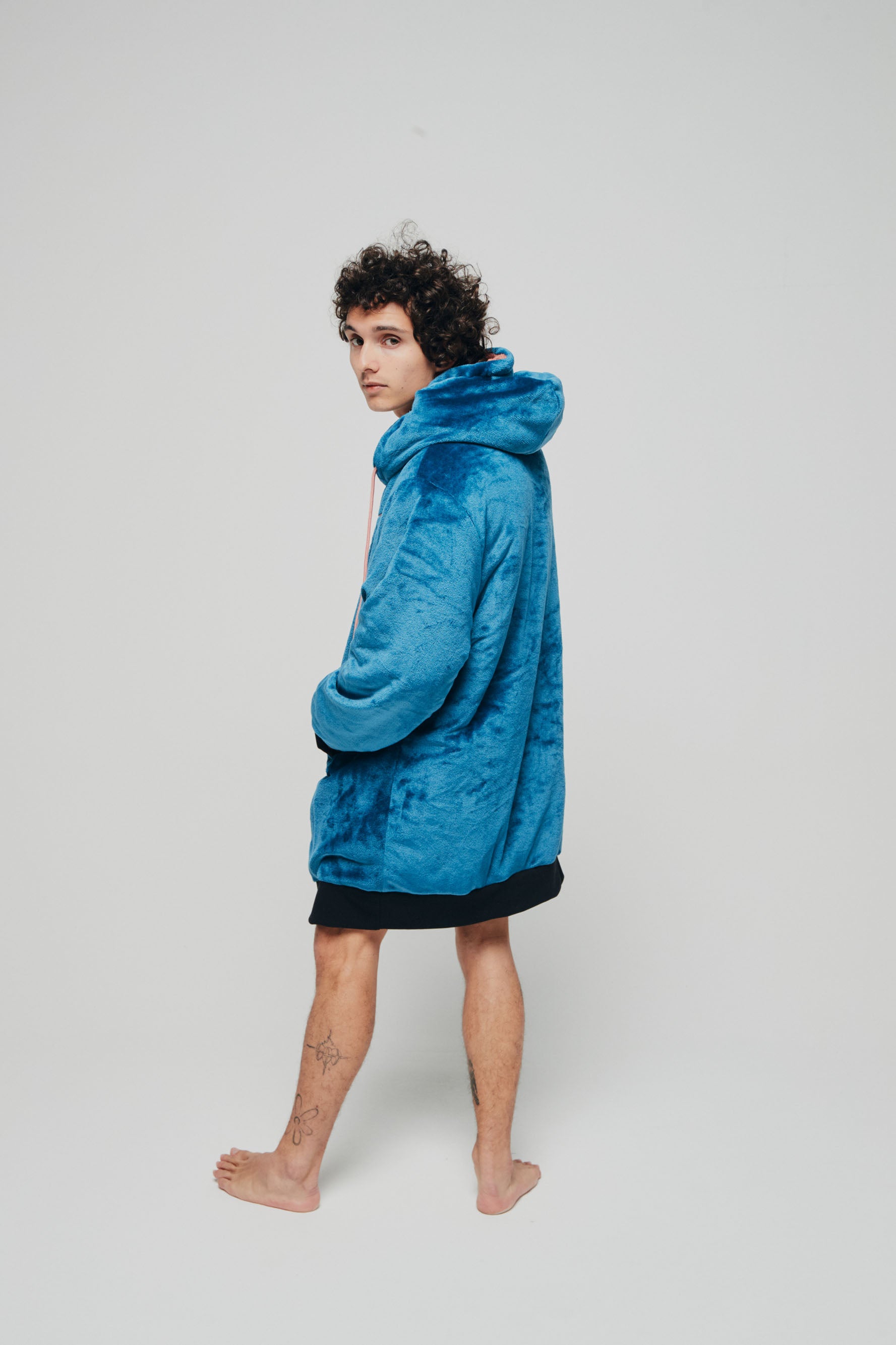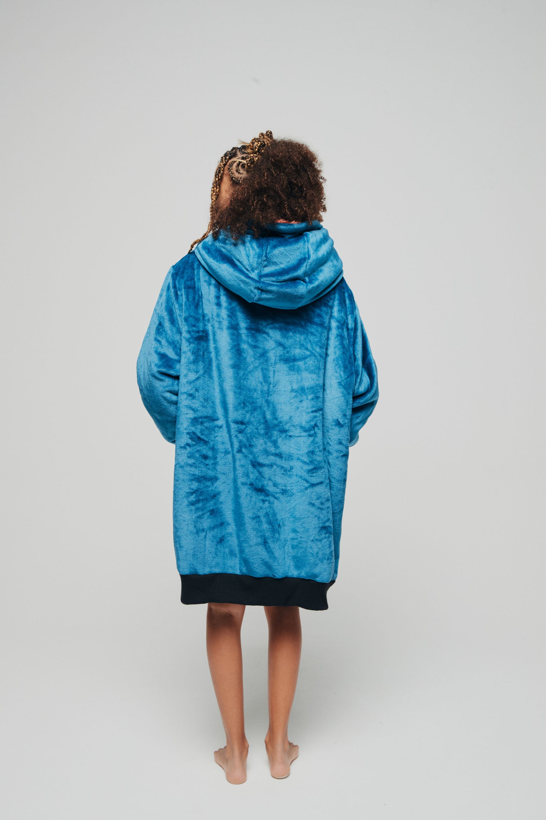 - Comme un sweat à capuche : manches longues avec ouvertures pour les pouces, capuche doublée et ajustable avec liens, deux grandes poches