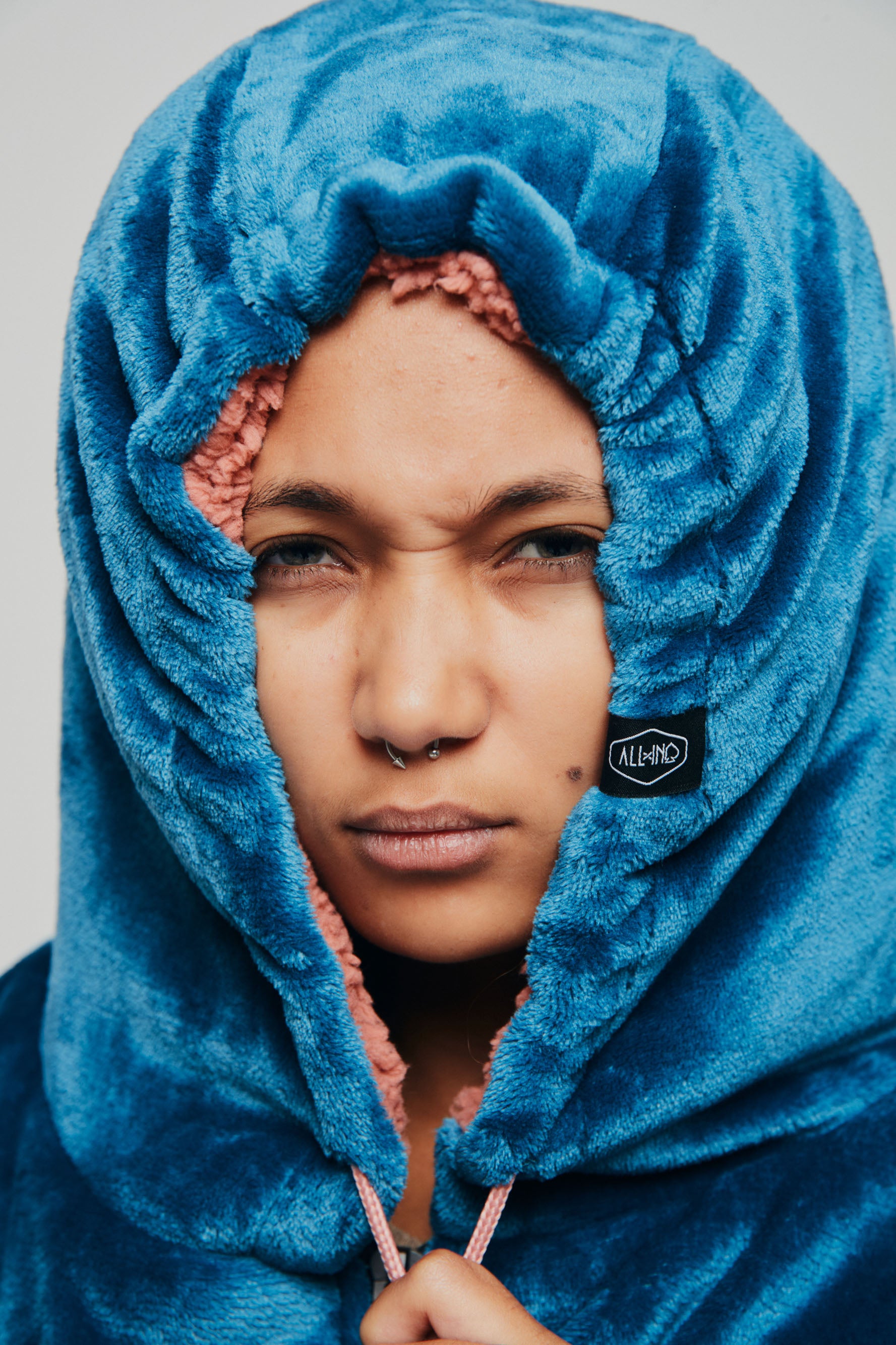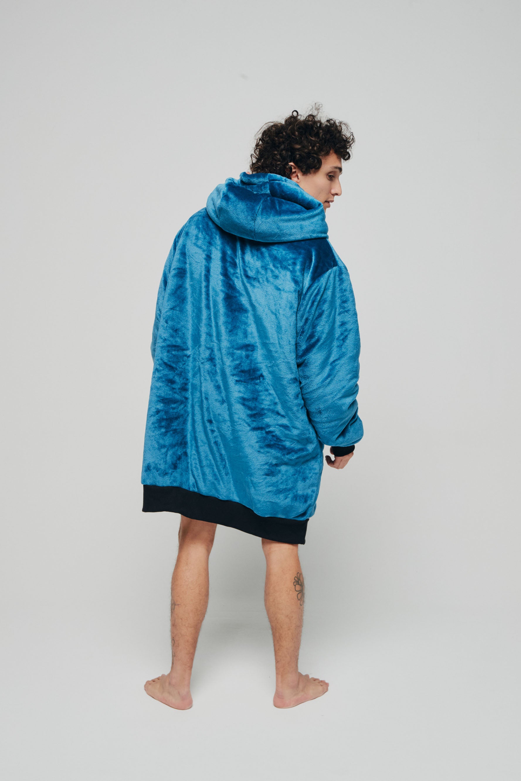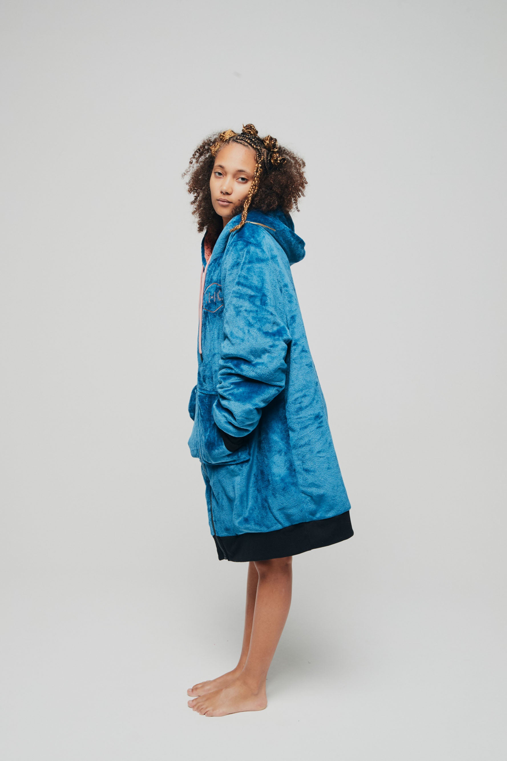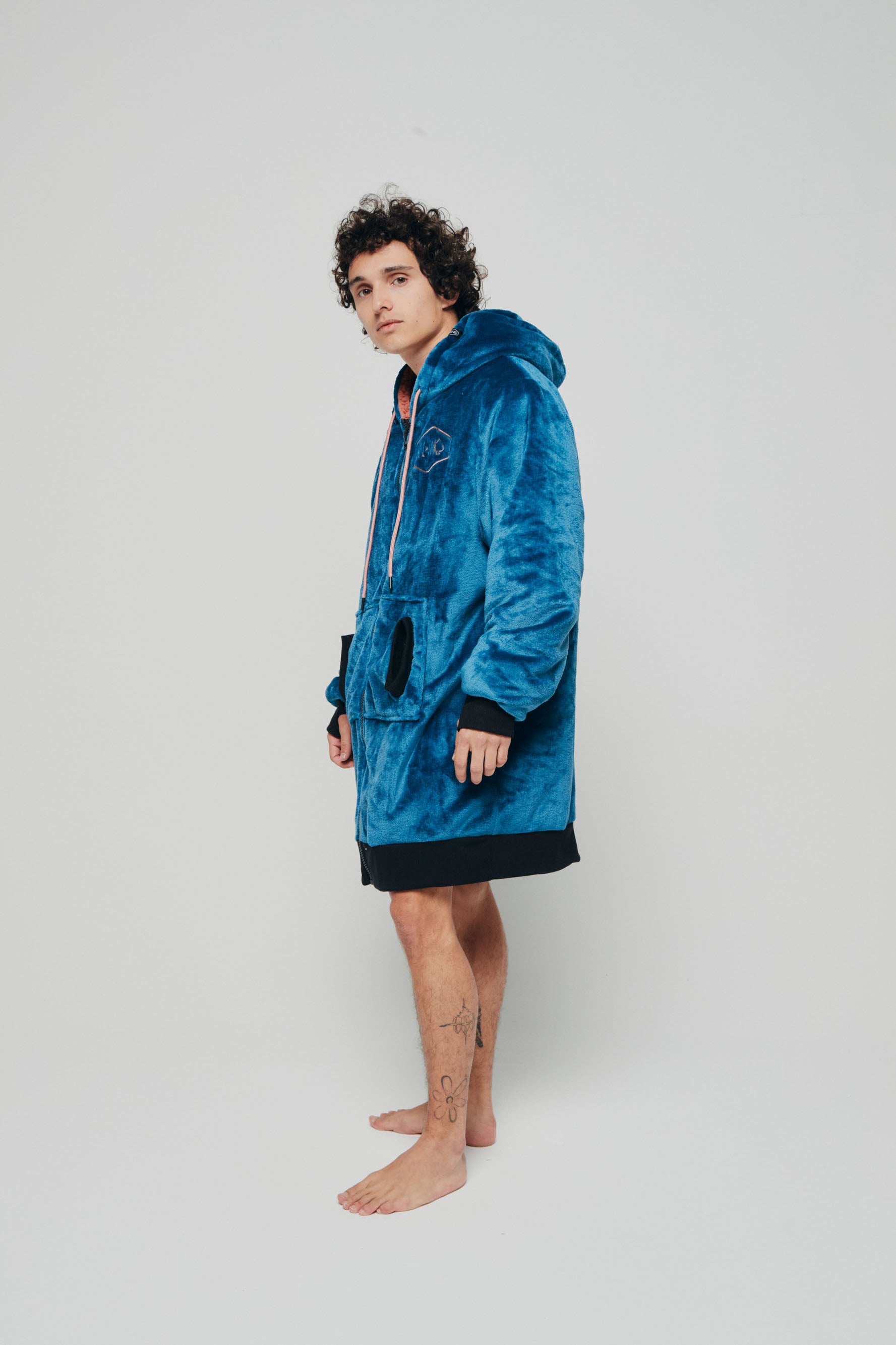 - Comme un sweat à capuche : manches longues avec ouvertures pour les pouces, capuche doublée et ajustable avec liens, deux grandes poches