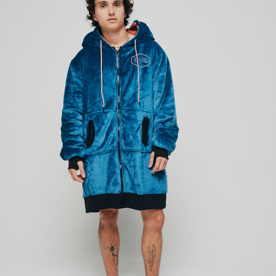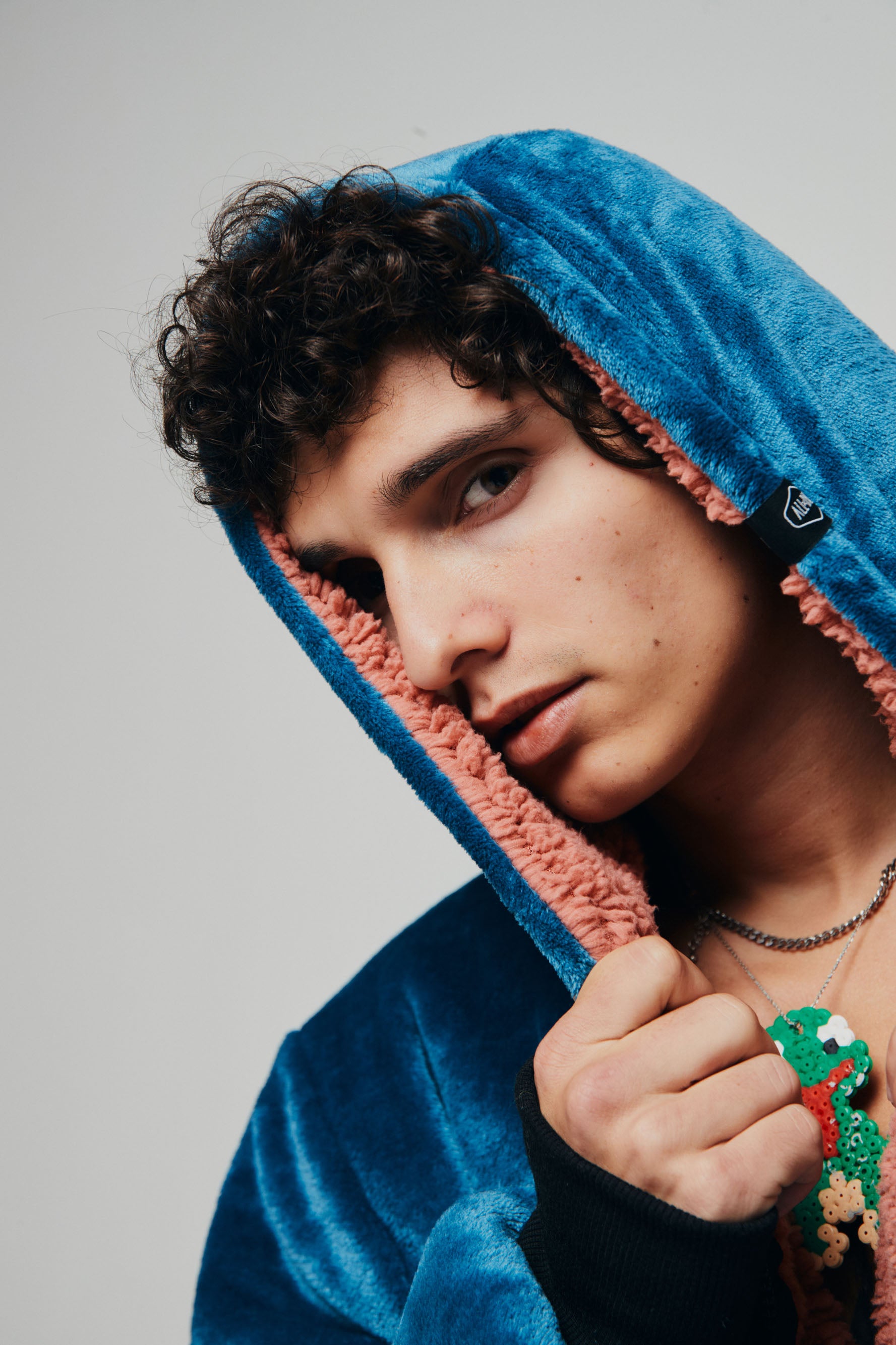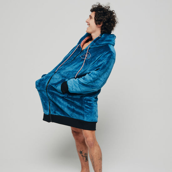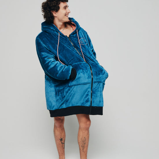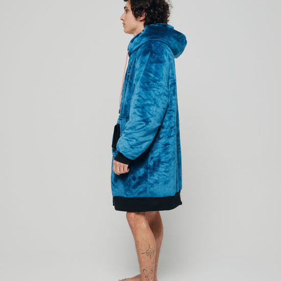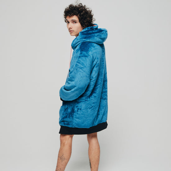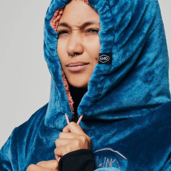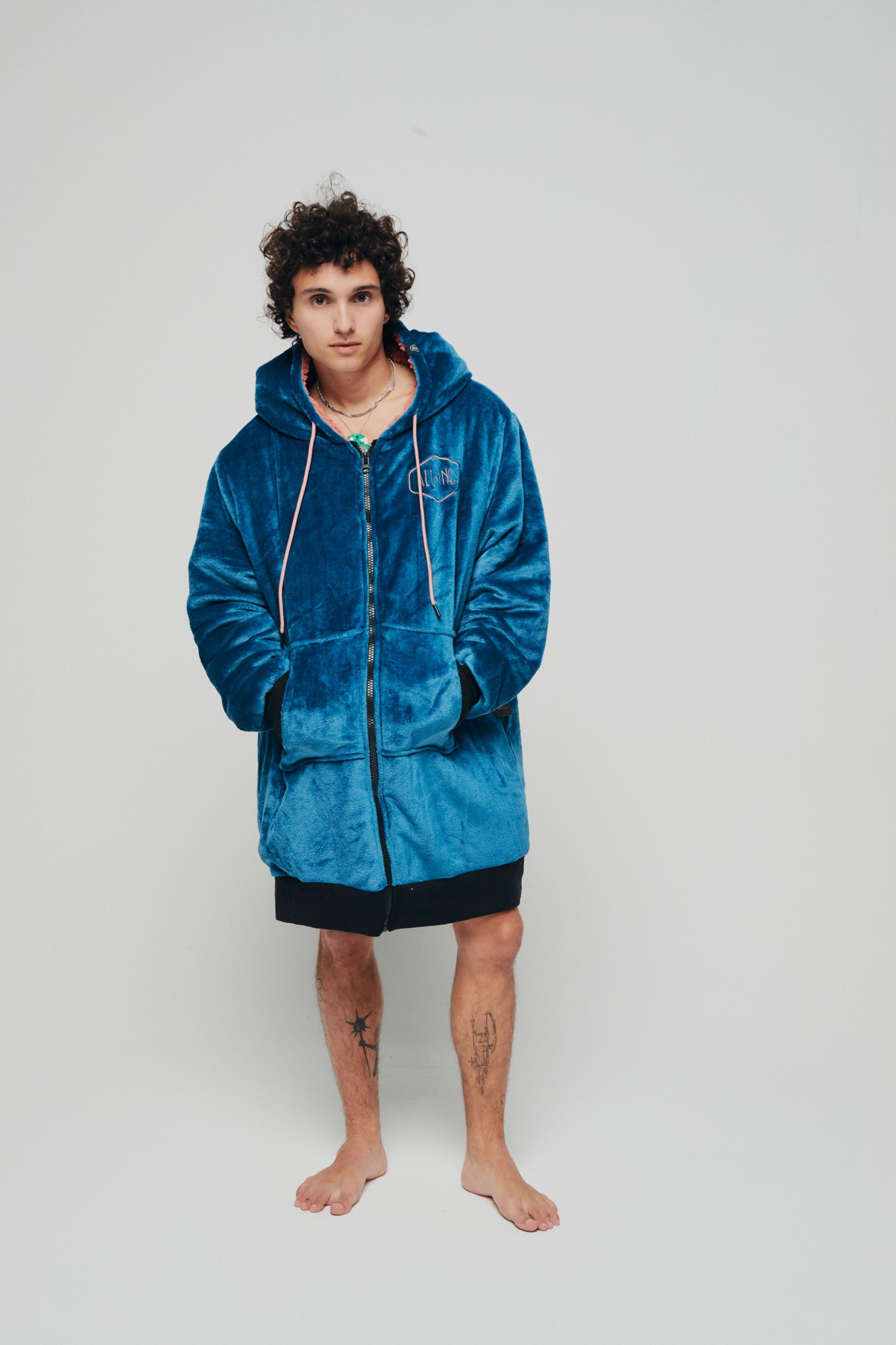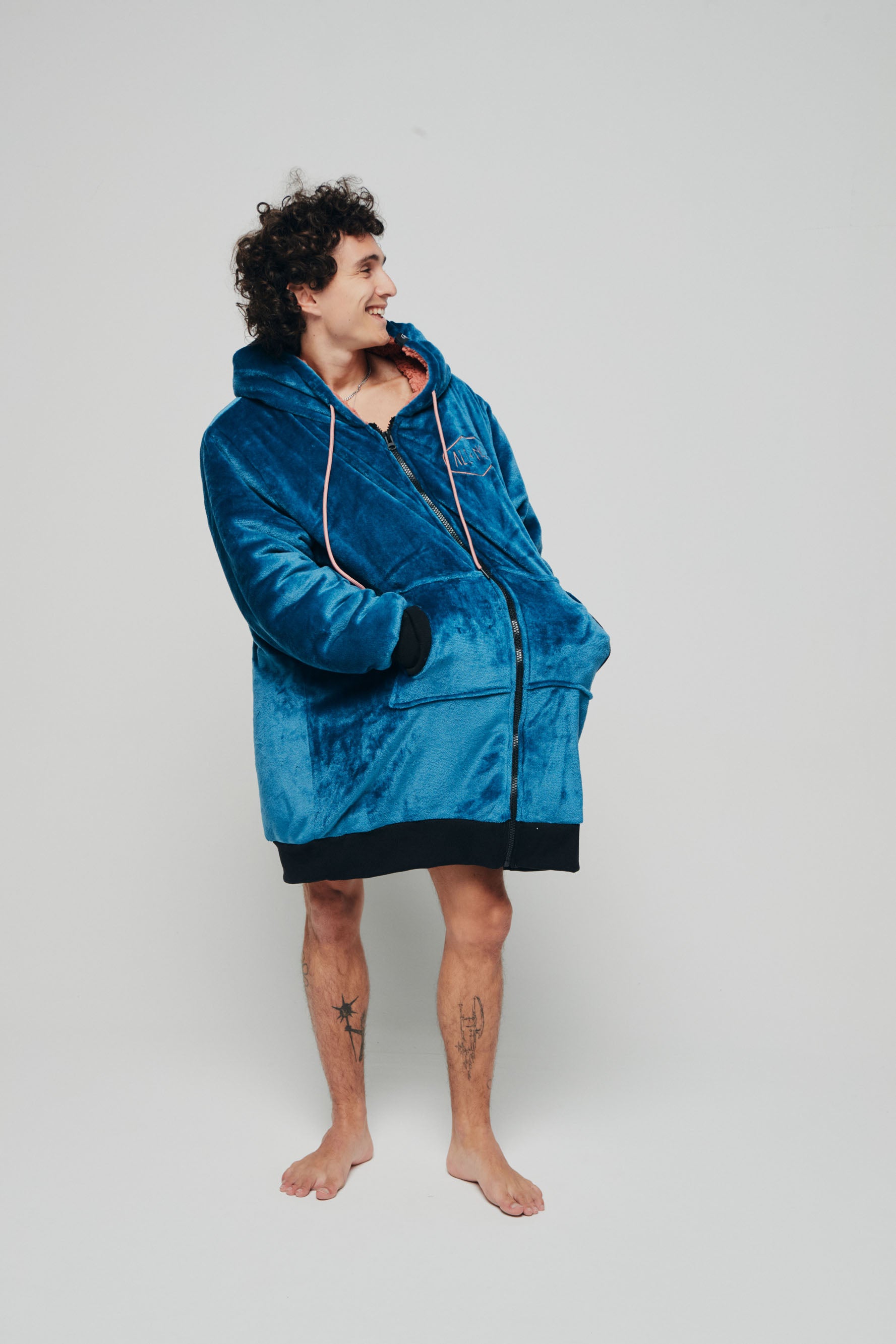 - Comme un sweat à capuche : manches longues avec ouvertures pour les pouces, capuche doublée et ajustable avec liens, deux grandes poches