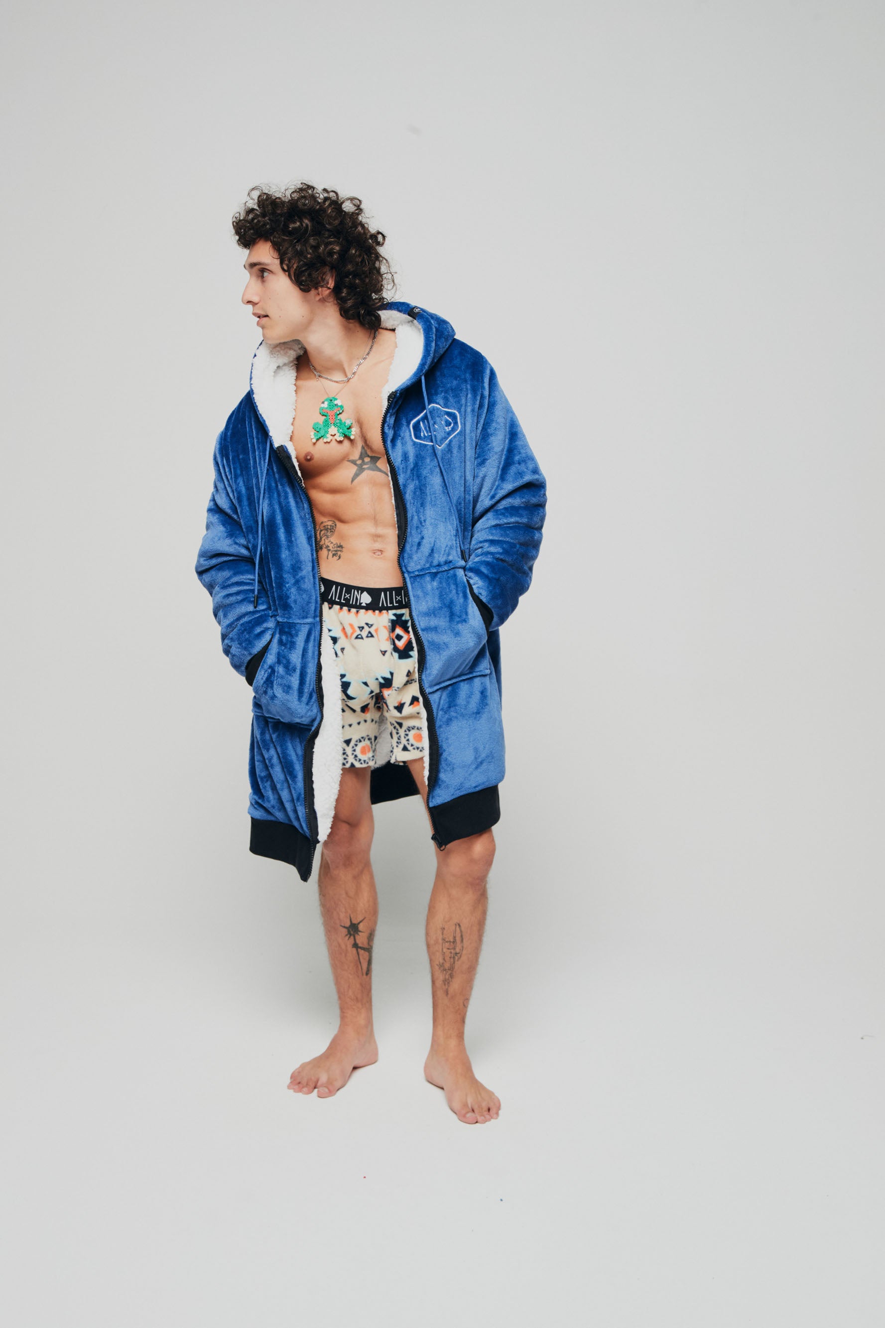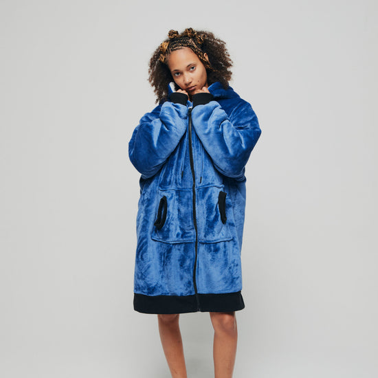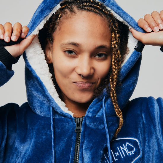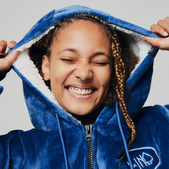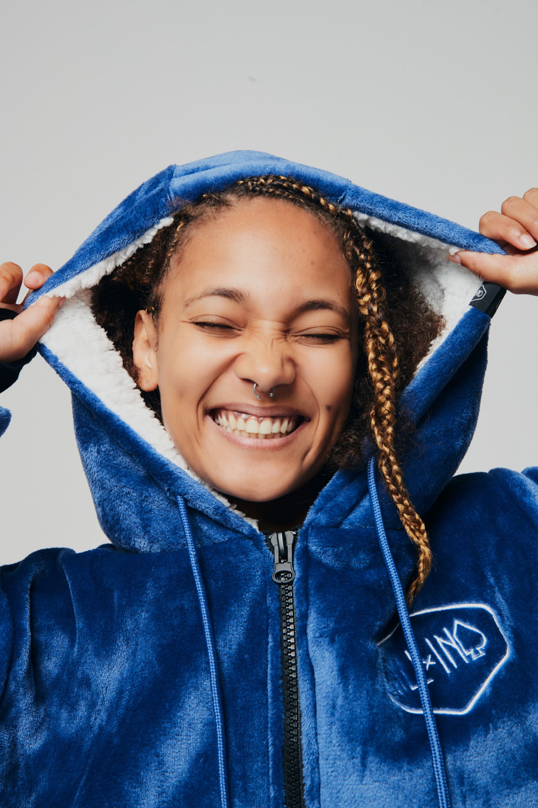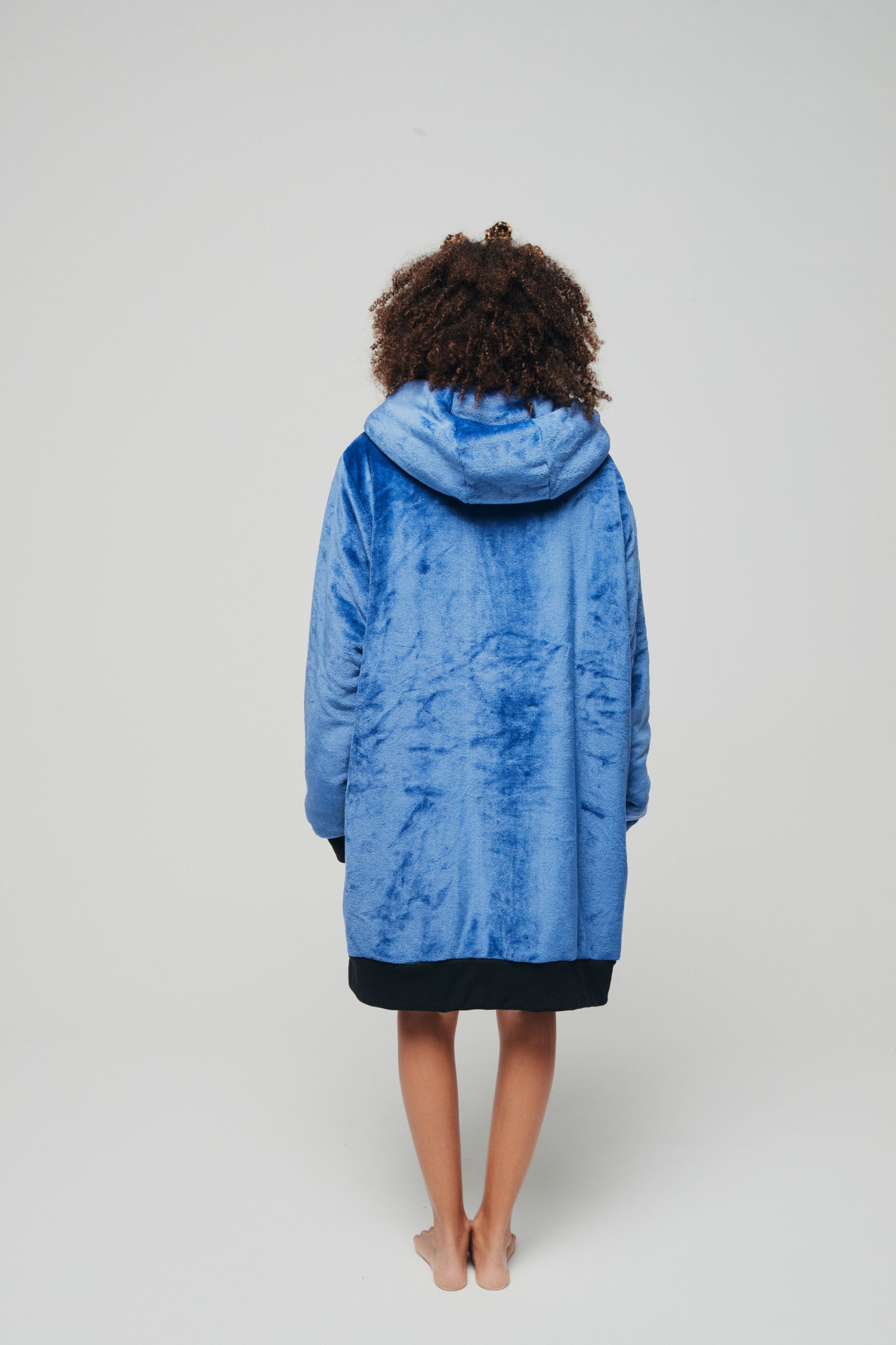 - Comme un sweat à capuche : manches longues avec ouvertures pour les pouces, capuche doublée et ajustable avec liens, deux grandes poches